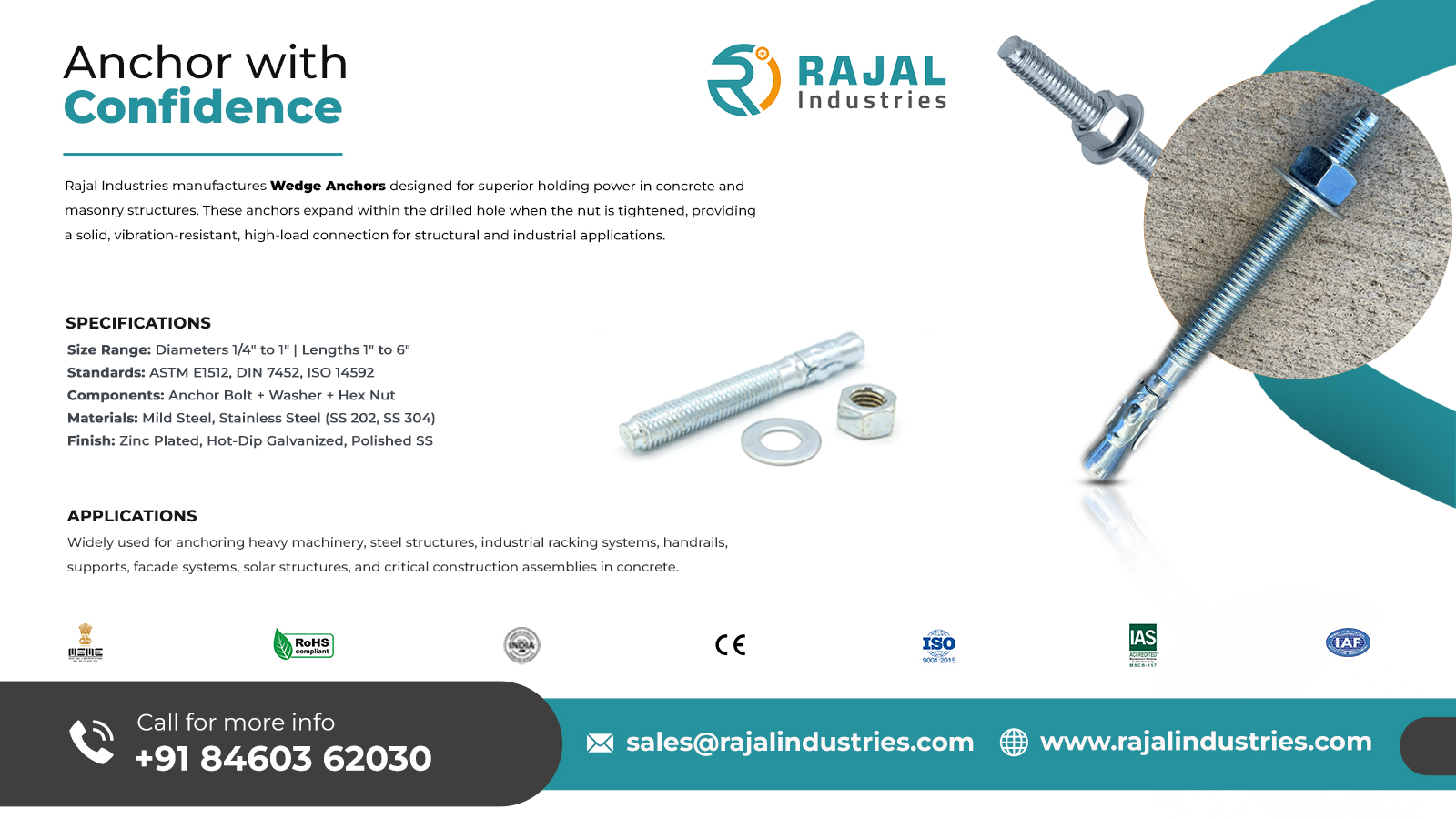 At Rajal Industries, we manufacture precision-engineered Wedge Anchors conforming to ASTM, DIN, and ISO standards, ensuring high holding power, corrosion resistance, and long-term durability in load-critical applications.