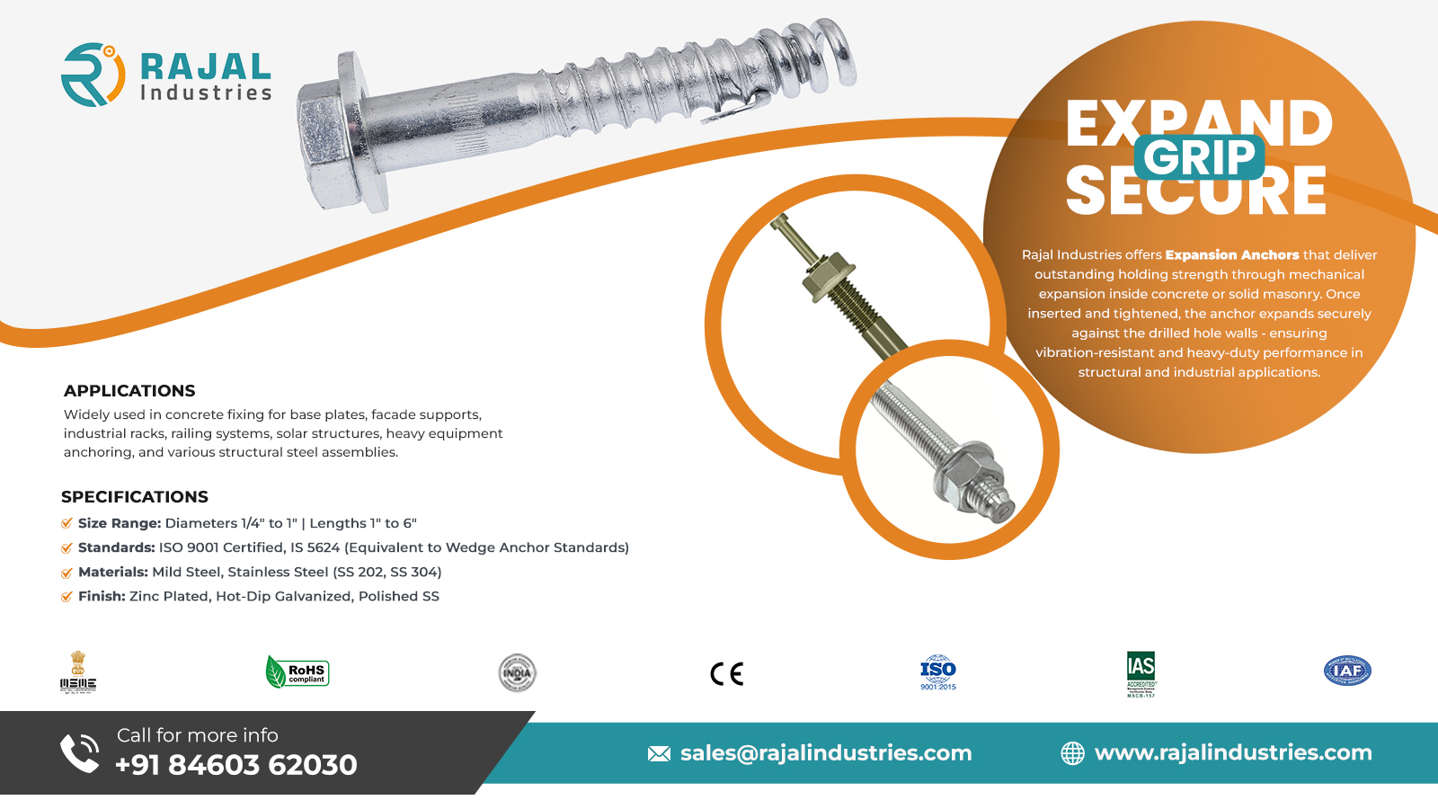 At Rajal Industries, we manufacture ISO 9001-certified Expansion Anchors conforming to IS 5624 and global fastening standards, ensuring high pull-out resistance, corrosion protection, and optimal performance in load-bearing applications.