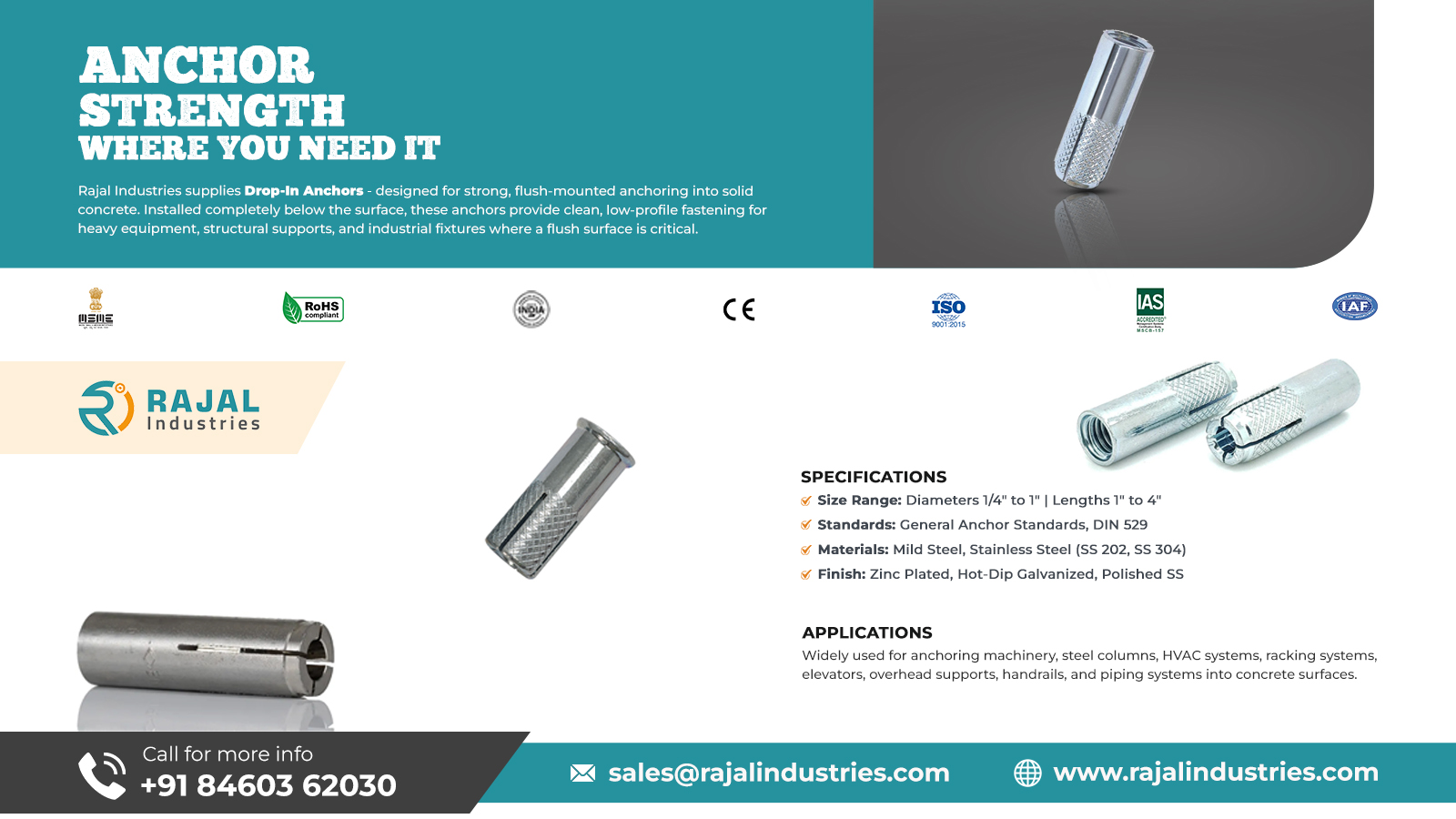 At Rajal Industries, we manufacture precision-engineered Drop-In Anchors conforming to DIN standards, ensuring reliable load-bearing capacity, corrosion protection, and secure fastening for industrial and structural applications.