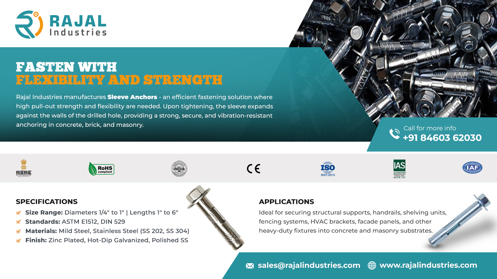 At Rajal Industries, we manufacture precision-engineered Sleeve Anchors conforming to ASTM, DIN, and ISO standards, ensuring high pull-out resistance, superior load-bearing capacity, and corrosion protection for long-term performance.