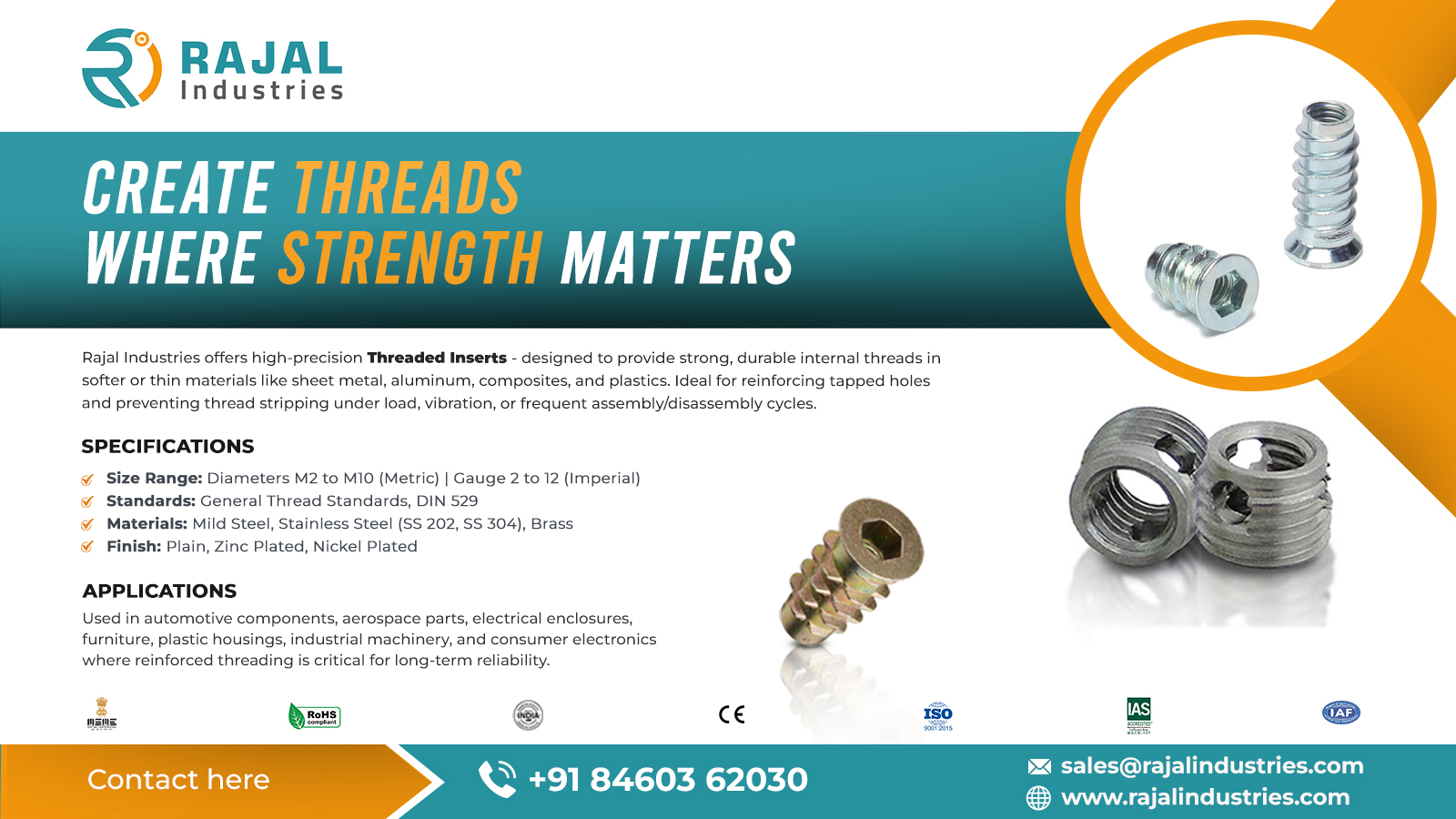 At Rajal Industries, we manufacture precision-engineered Threaded Inserts conforming to DIN and general industry standards, ensuring high-strength performance, corrosion resistance, and secure fastening for industrial, automotive, aerospace, and repair applications.