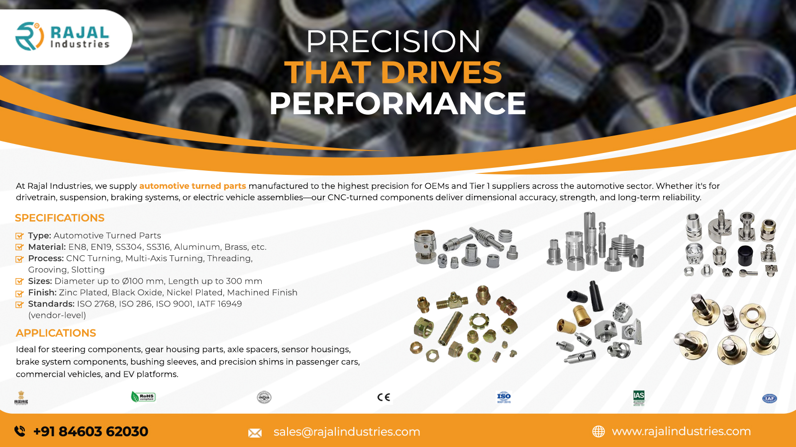 At Rajal Industries, we specialize in precision-machined automotive components that meet ISO/TS 16949 automotive quality standards, ensuring dimensional accuracy, material strength, and long-term durability for OEMs, aftermarket suppliers, and performance vehicle applications.