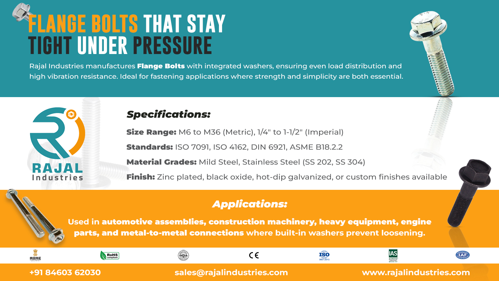 At Rajal Industries, we manufacture ISO, ASME, and DIN-compliant flange bolts with precise threading, superior material quality, and corrosion-resistant coatings to meet the demands of industrial and high-performance applications.
