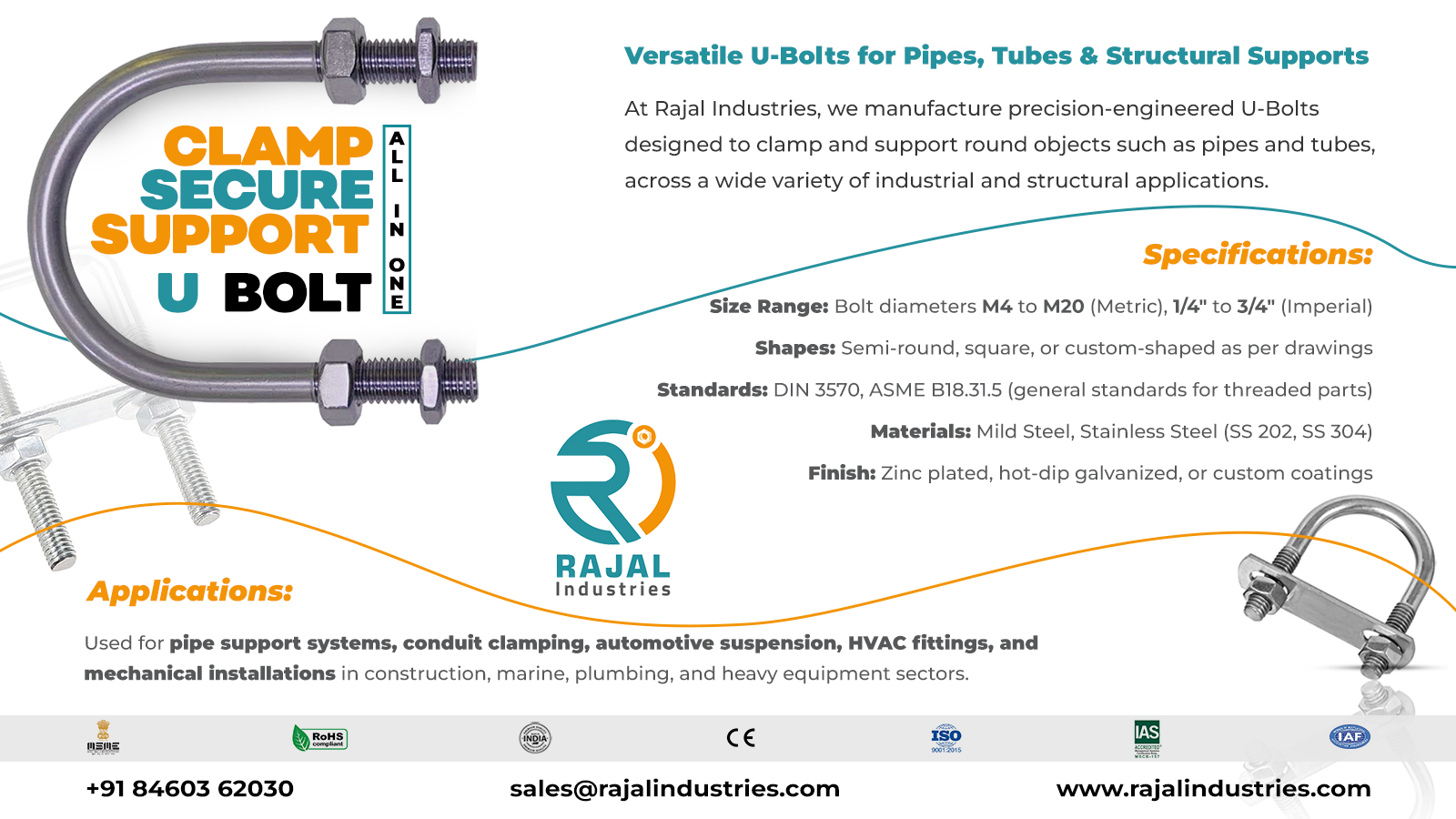 At Rajal Industries, we manufacture precision-engineered U-bolts that conform to DIN, ASME, and general bolt standards, ensuring high tensile strength, corrosion resistance, and secure fitment across diverse industrial uses.