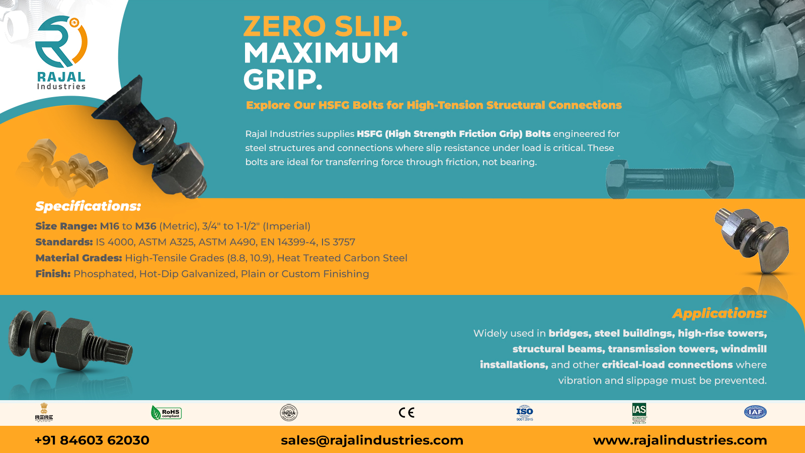 Manufactured to IS, ASTM, and EN standards, our HSFG bolts are heat-treated for high tensile strength, excellent shear resistance, and long-term durability. Rajal Industries provides precision-engineered HSFG bolts for steel-to-steel connections, high-rise buildings, and critical engineering applications.