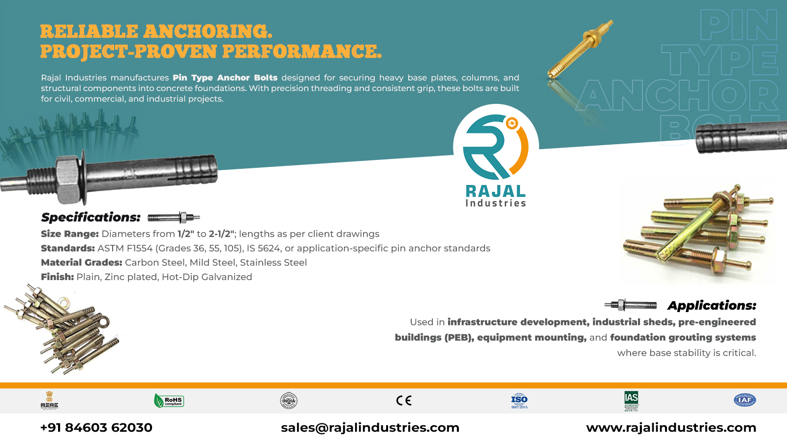 At Rajal Industries, we manufacture precision-engineered pin type anchor bolts that conform to ASTM and IS standards, ensuring exceptional tensile strength, corrosion resistance, and durability. Our pin type anchor bolts are widely used in construction, bridges, power plants, and industrial installations.