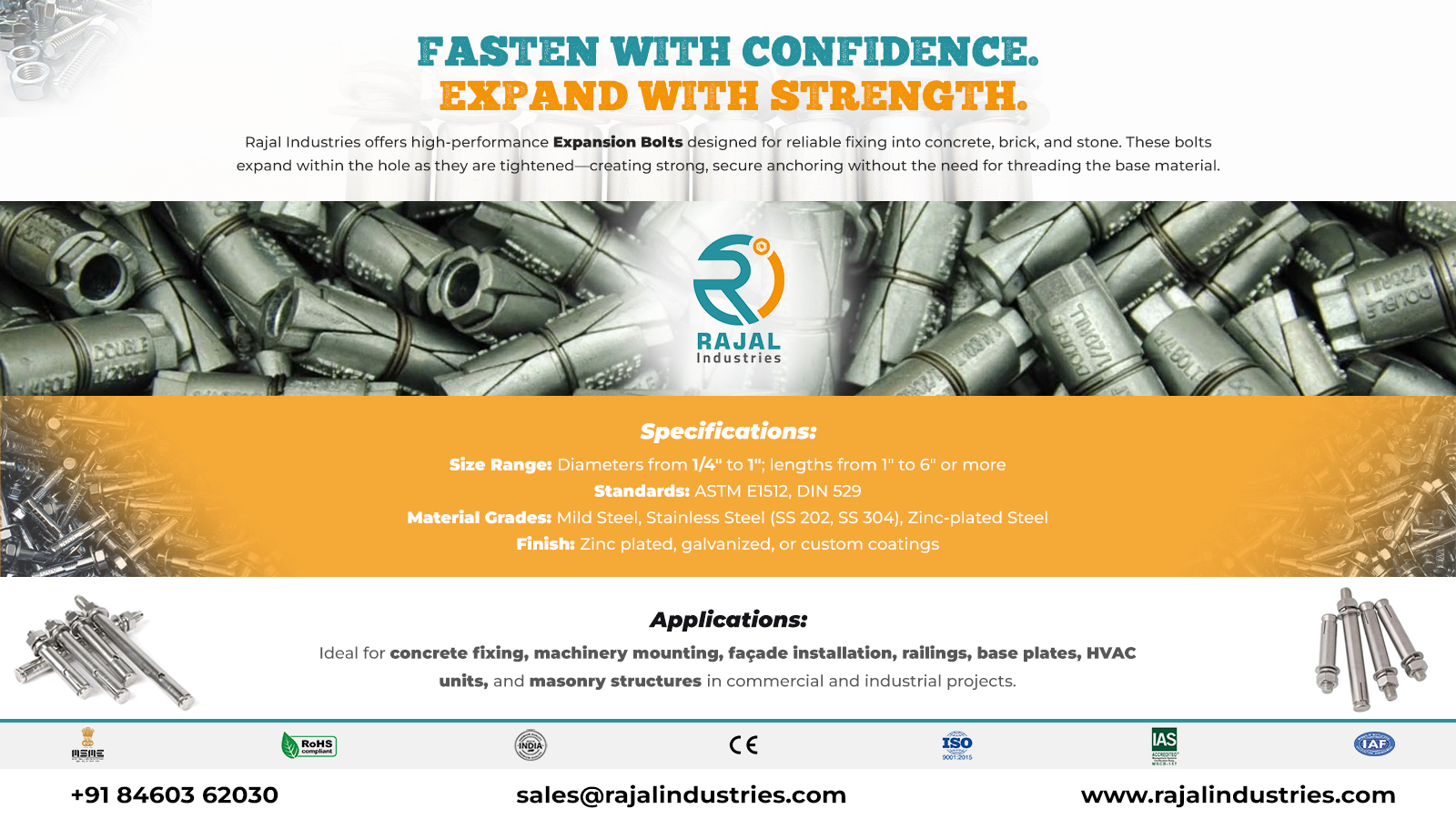 At Rajal Industries, our expansion bolts are engineered to ASTM and DIN standards, offering high pull-out resistance, corrosion protection, and durability for industrial and infrastructure applications.