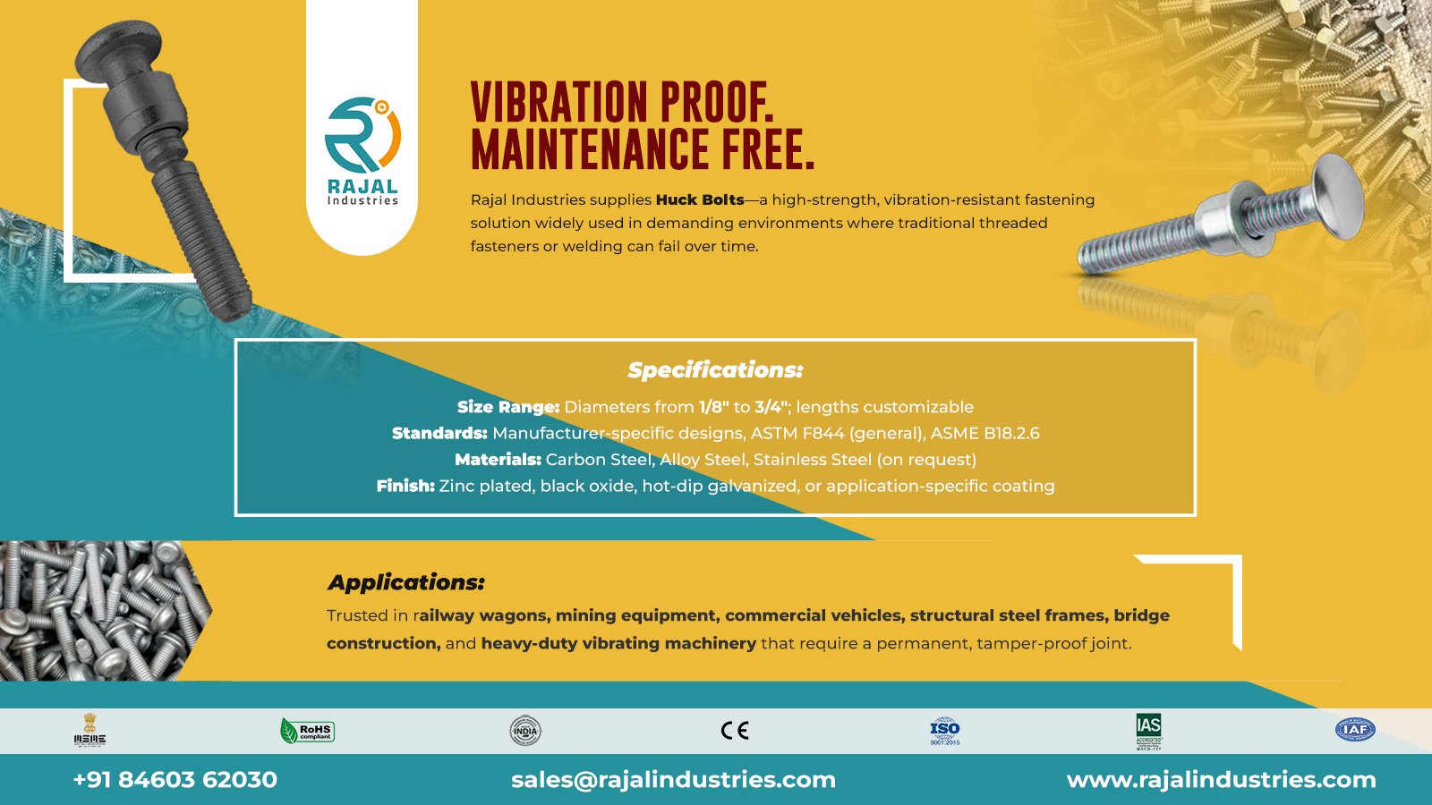 At Rajal Industries, we supply precision-engineered Huck Bolts that conform to ASTM, ASME, and manufacturer-specific standards, ensuring high shear and tensile strength, corrosion resistance, and long-lasting reliability in demanding environments.