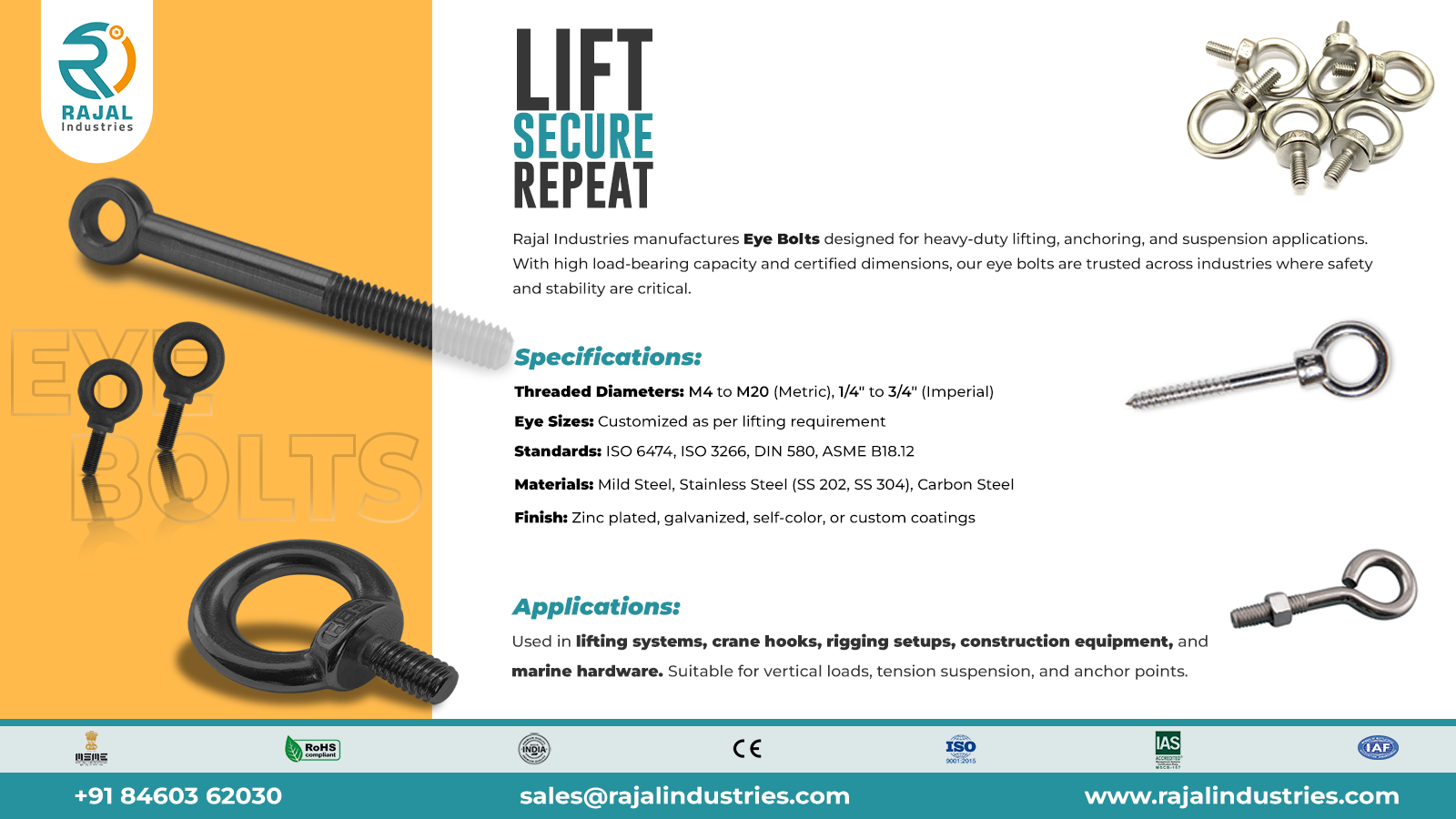 At Rajal Industries, we manufacture precision-engineered Eye Bolts that conform to ISO, ASME, and DIN standards, ensuring high load-bearing capacity, corrosion resistance, and durability in demanding environments.