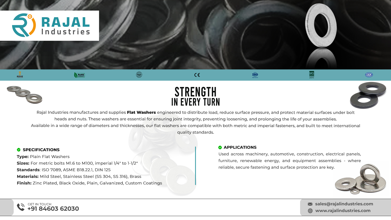 At Rajal Industries, we manufacture precision-engineered Flat Washers conforming to ISO, ASME, and DIN standards, ensuring high-strength performance, corrosion resistance, and compatibility with various bolt and nut sizes.