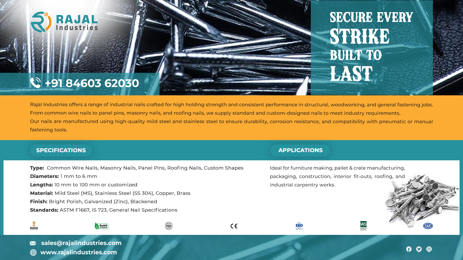 At Rajal Industries, we manufacture high-quality nails conforming to ASTM, IS, and industry-specific standards, ensuring superior holding power, corrosion resistance, and durability for diverse fastening needs.