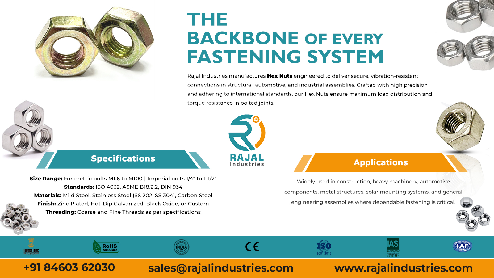 At Rajal Industries, we manufacture precision-engineered Hex Nuts conforming to ISO, ASME, and DIN standards, ensuring superior thread fitment, high load-bearing capacity, and long-term performance.