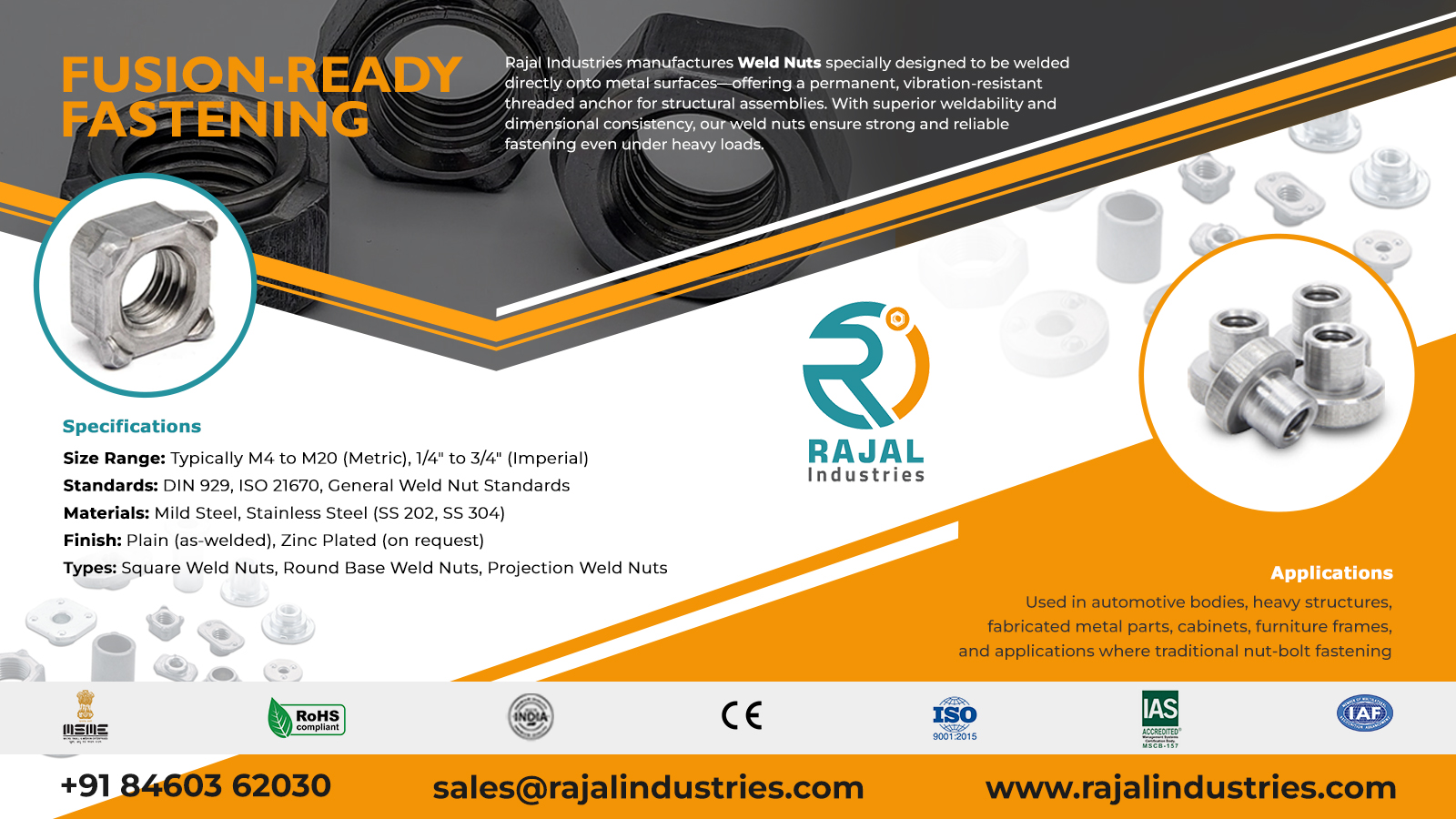 At Rajal Industries, we manufacture precision-engineered Weld Nuts conforming to DIN and ISO standards, ensuring strong weldability, superior thread engagement, and long-term durability.
