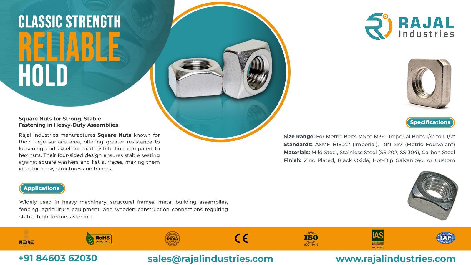At Rajal Industries, we manufacture precision-engineered Square Nuts conforming to ASME and DIN standards, ensuring durability, anti-loosening performance, and high tensile strength.