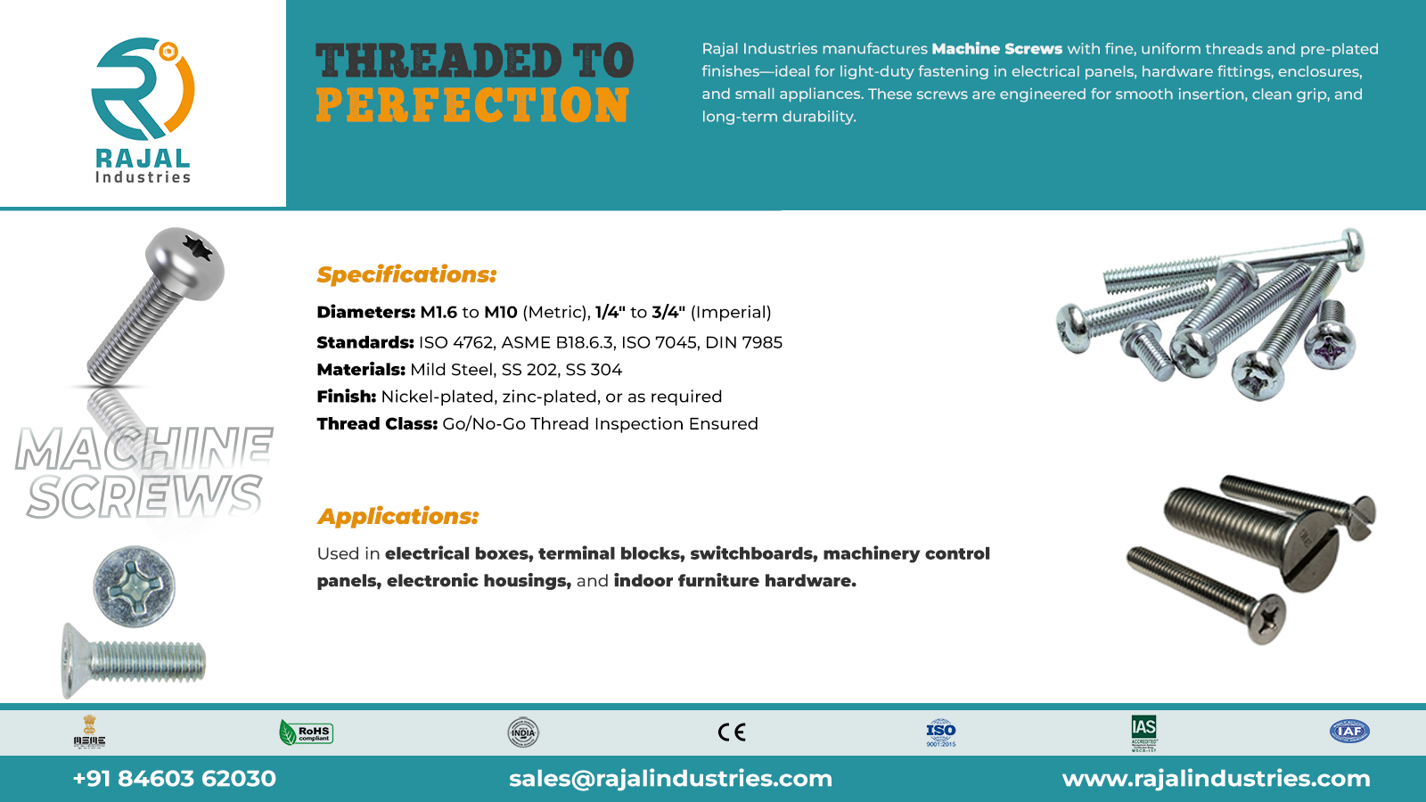 At Rajal Industries, we manufacture ISO, ASME, and DIN-compliant machine screws with accurate threading, uniform head styles, and high-strength materials, ensuring long-lasting performance in high-precision applications.