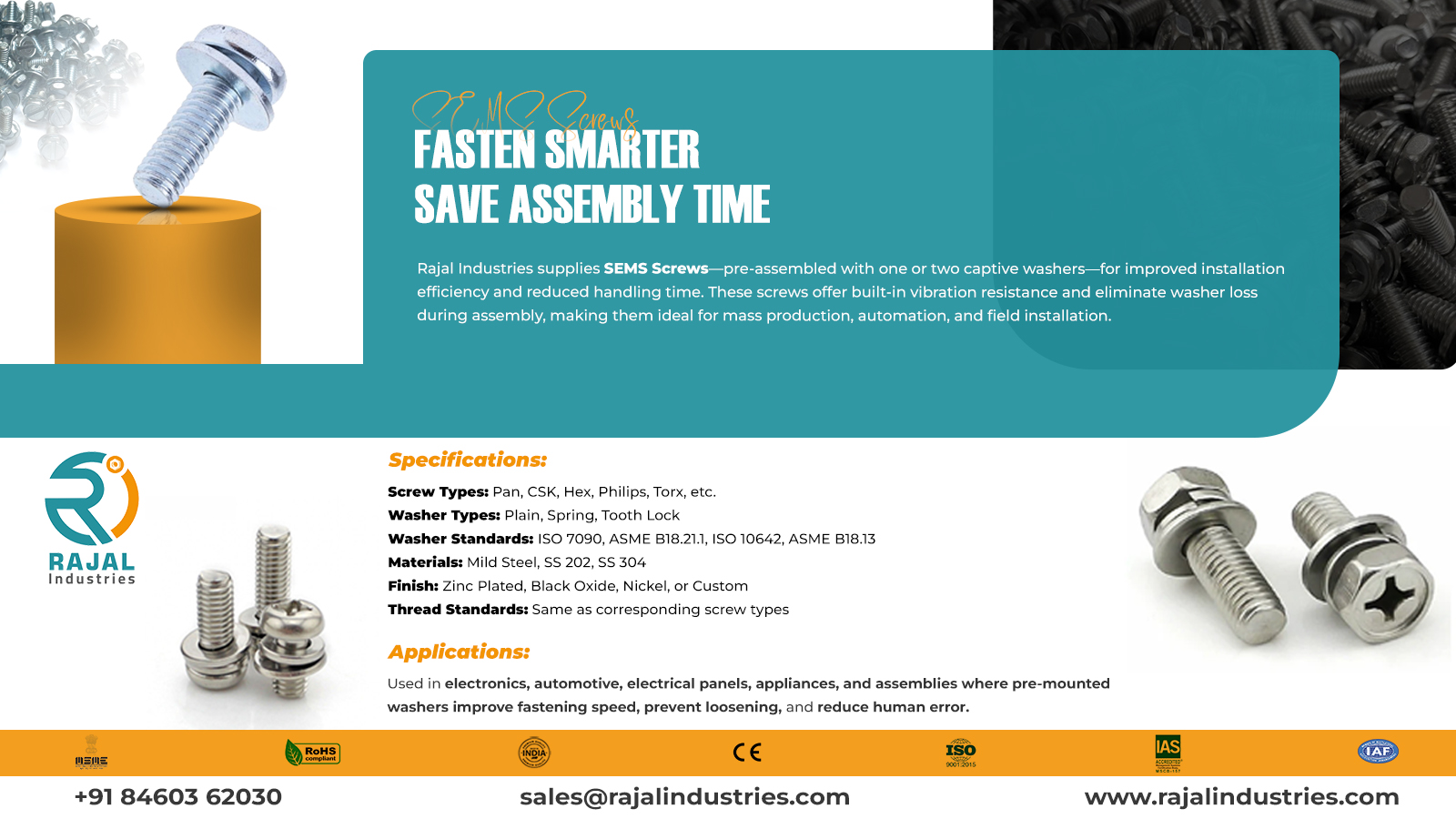 At Rajal Industries, we manufacture precision-engineered SEMS screws that conform to ISO and ASME standards, ensuring high tensile strength, ease of installation, and long-lasting performance.