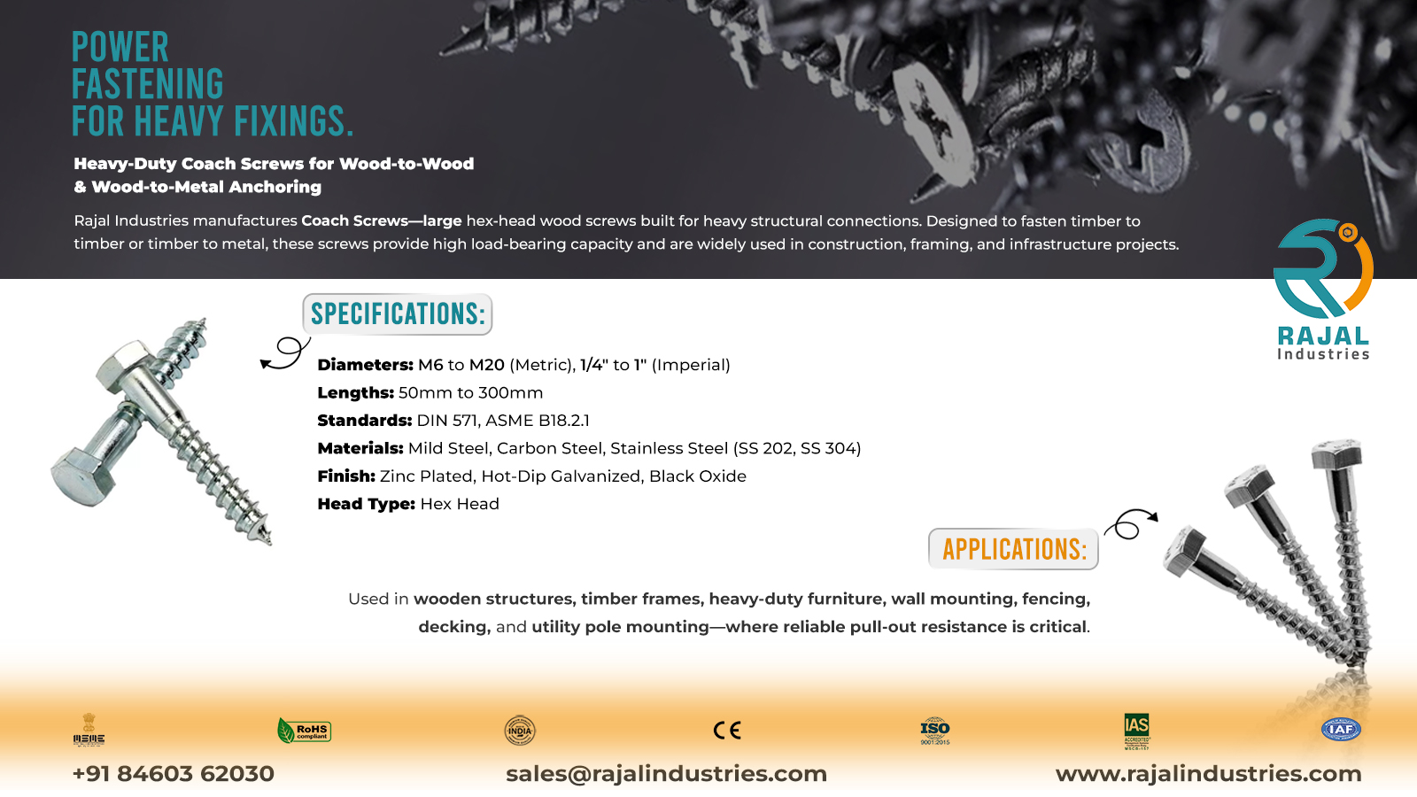 At Rajal Industries, we manufacture high-performance coach screws that conform to DIN and ASME standards, offering superior strength, long-term durability, and ease of installation in construction, carpentry, and heavy engineering applications.