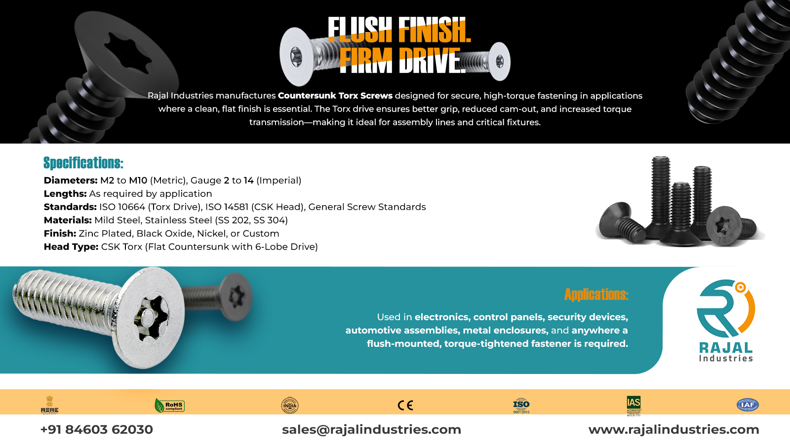At Rajal Industries, we manufacture precision-engineered countersunk Torx screws that conform to ISO standards and general screw specifications, ensuring exceptional grip, precision fitment, and long-term reliability.