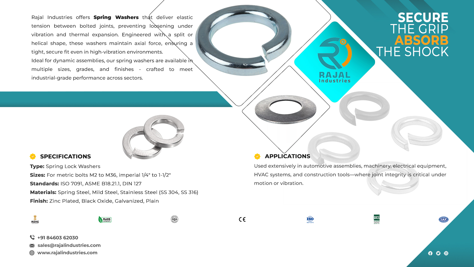 At Rajal Industries, we manufacture high-precision Spring Washers conforming to ISO, ASME, and DIN standards, ensuring reliable locking performance, corrosion resistance, and superior load distribution in industrial and structural applications.